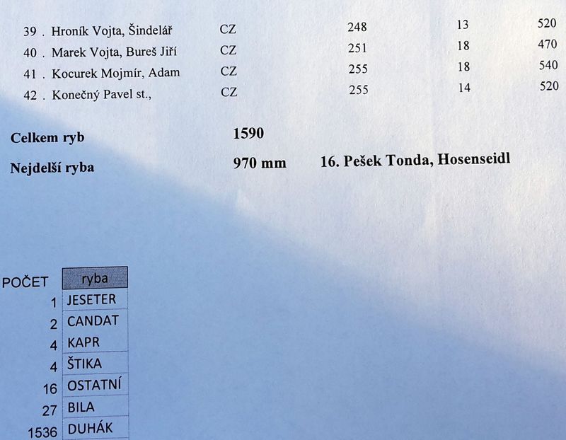 Největší rybu ulovil Míla Hosenseidl – jesetera 97cm