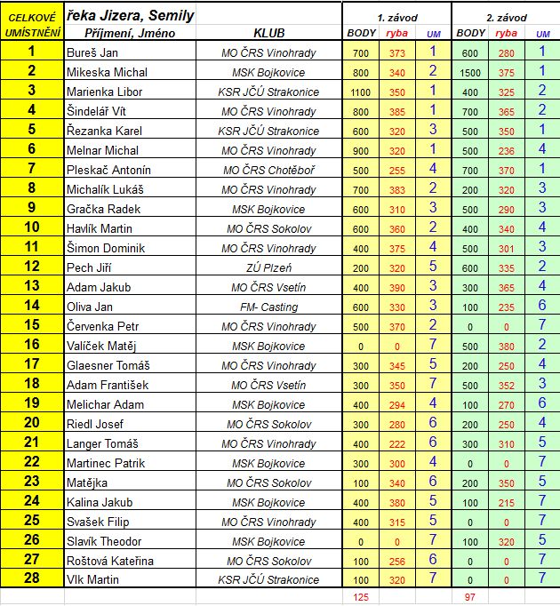 Krásné počasí, příroda, řeka, … jen těm rybám se moc nechtělo. Celkem se ulovilo jen něco málo pod čtyři sta ryb. A to na Jizeru je opravdu málo. Dokonce i když jsme si šli zachytat na jinak tutové místa to nebylo jako jiné roky. Ale ryby pěkné. Cena XXL za lipana přes čtyřicet cm , to je slušné. Odnesl si ji Jirka Pech. Černou kapkou a rozčarováním všech, bylo ale rozhodnutí státního trenéra Martina Gruna o tom, že první desítka v žebříčku