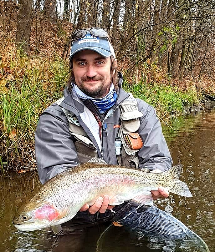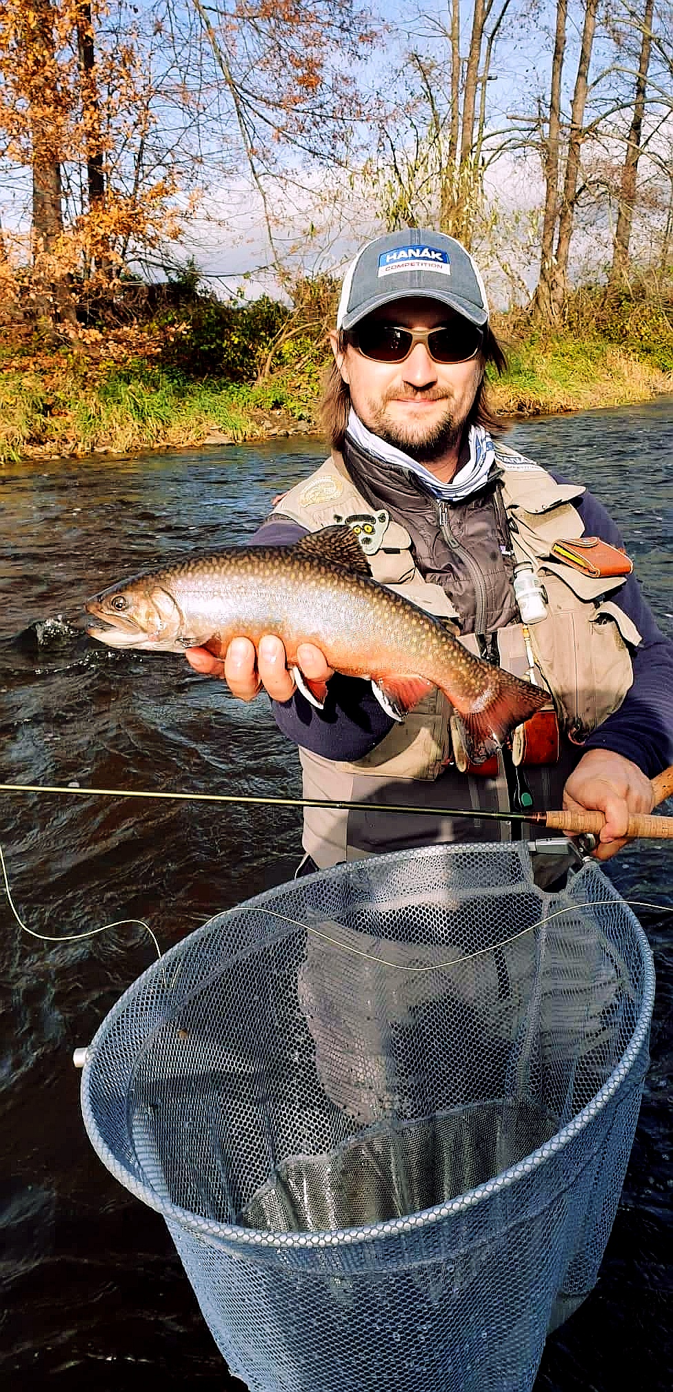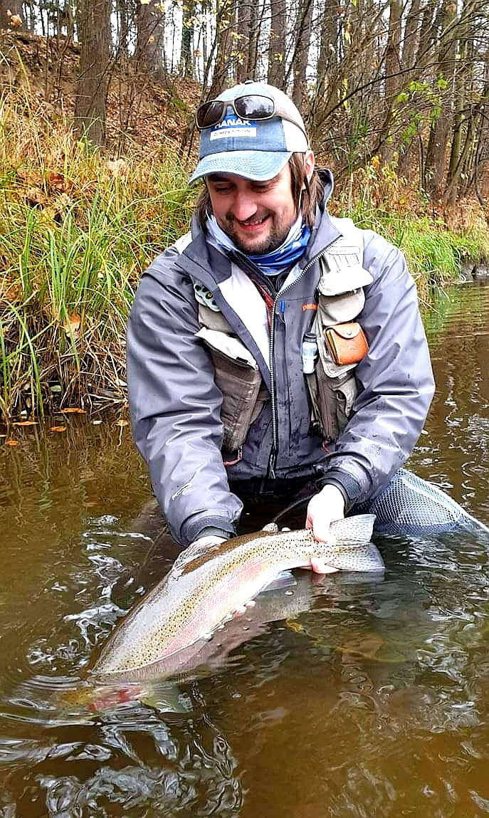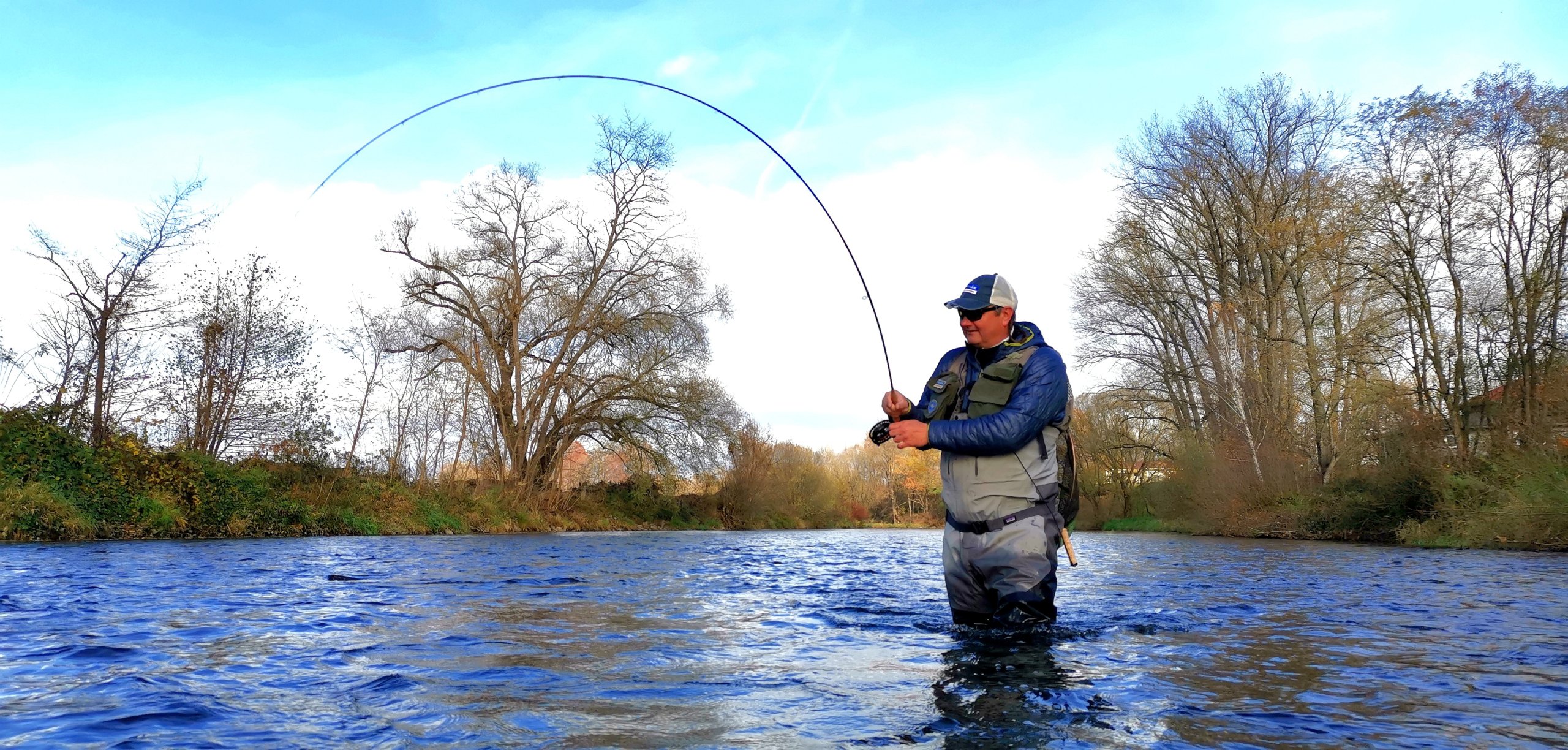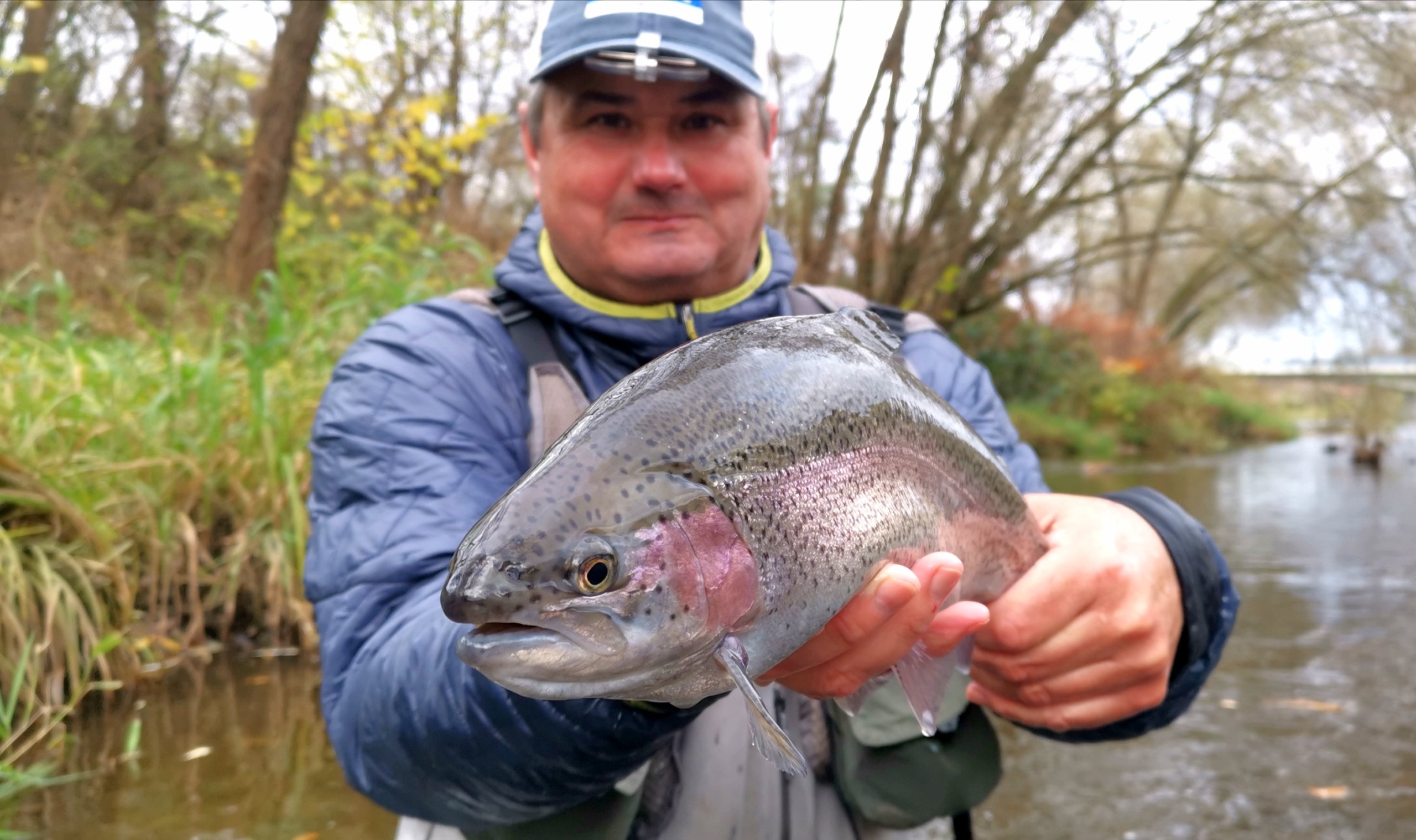 Takže jsme si naladili sestavy a hurá do vody. Já v rámci zkoušení nových věcí nabil nymfu s francouzským návazcem, i přestože to nemám vůbec v lásce a spíš se tomu vyhýbám. Nicméně jsem se chtěl s nymfováním zakopat válečnou sekyru, protože moje nechuť k nymfování mi občas zavařila i na závodech. Ale občas i pomohla. Zkrátka, měl bych si nymfování víc užívat. Začátek jsme si s Fandou dali na našem obvyklém místě a protože jsem měl nabito a Fanda ne, hodil jsem si první. Ihned záběr a hezký duhák kolem 40cm mě krásně přivítal. Nutno podotknout, že jsem šel do extrému a nabil vlasec 0,12mm a dvě nymfy s halvičkou 3,0mm. Přívěs jistil Sirupčík, což je tmavá muška, která v chladné vodě funguje skvěle, ale on Sirupčík vlastně funguje vždy a všude, takže žádné velké umění. Pod něj jsem nabil opět jistotu, která nikdy nezklame, Promotávku. Tuhle sestavičku jsem tam válel celé dopoledne a nutno říct, že až na pár menších duháků, sivenů a jelců se totální masakr nekonal. Ne že bych si nezachytal, ale spíše jsem byl zvyklý na větší velikosti, takzvané obouručáky. Po obědě jsme přejeli trochu výše a zbytek dne strávili na pomalejší vodě, kde jsme dochytali nějaké další duháky a siveny do 45cm, spíš ale měli pod 40cm. Nechci říct, že by mi tyto ryby byly málo, ale ten trend trophy tady byl trochu jiný. Nakonec se mi dostalo informace, že větší ryby na podzim nebyly, ale ony zase budou!