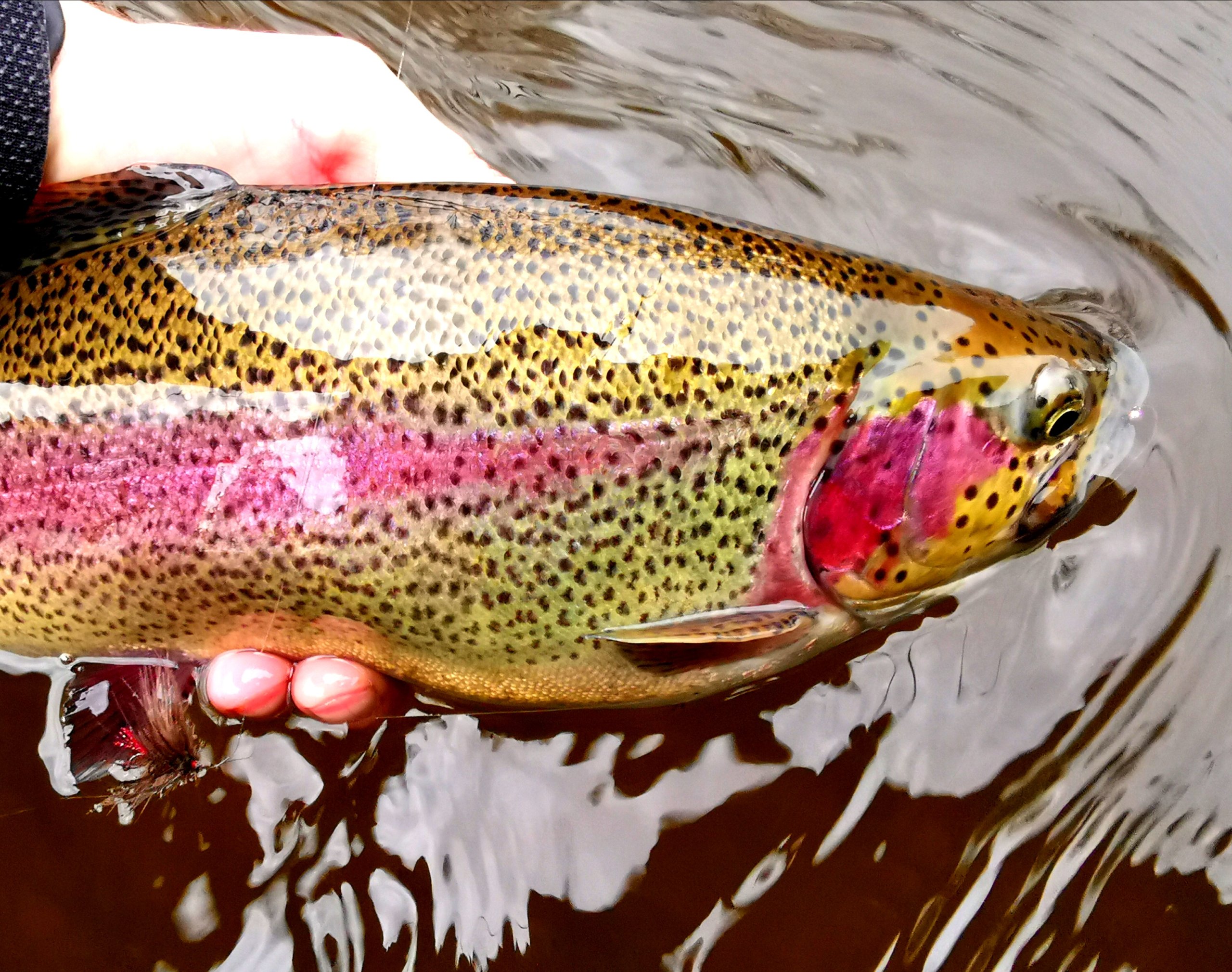 Večer láhev nebo dvě kvalitního rumu a ráno skvělý hemenex a opět do vody. Tentokrát jsem volil suchou šňůru a nymfu pod splávkem. Zvolil jsem klidnější pasáž, kde chodí málo lidí a občas tady zůstane i lepší ryba. Pomalu jsem kráčel proti vodě a takticky prochytával vějíř nade mnou. Byl jsem překvapený, když jsem začal chytat poměrně hodně těch menších nasazených duháků, kteří se místo po vodě vydali proti vodě a neváhali tak ze sádek plout proti proudu. Jako splávek jsem použil klasickou Rockerku větší velikosti a pod ní jsem střídal Sirupčíka s Bažantem. Asi po 10 rybách během půl hoďky přišel další záběr a klasický rychlý únik, který tady znám od těch větších ryb. Opět jsem chytal na 0,12 silon a tak jsem musel opatrně, ono stejně nemůžete brzdit víc, když kromě tenkého vlasce mate ještě mušku na H130BL. Nicméně to jde, ale je nutné drže rybu nad vámi proti proudu, protože jak začnete tahat proti proudu vy, je dost velká šance, že o rybu přijdete. Netrvalo dlouho a nádherný duhák tipuji kousek pod 60cm byl v podběráku. Jak to okomentoval Franta, tak tohle už byl obouručák, což je ryba, která už se musí držet oběma rukama. Krásná čistá ryba bez známky poškození s očima jako srnci, když o nich psal Ota Pavel. Pár rychlých fotek a už plaval zpět. Dochytali jsme toto místo s Fandou a já pak ještě s trojkou prutem nabil streamer na suchou šňůru, protože se mi z lenosti nechtělo jít pro štikový prut, abych to prohodil cvičně. Takže jsem to cvičně prohodil s tou trojkou prutem a jsem si vzpomněl na Igiho, který trpí štičí horečkou, že by byl na mě pyšný. Kously mi do toho tři štičky, tak to 50cm, ale nevytáhnul jsem ani jednu, protože to prostě neproseknete. A dva ducháčci zůstali sedět, což ale nebyl cíl.
