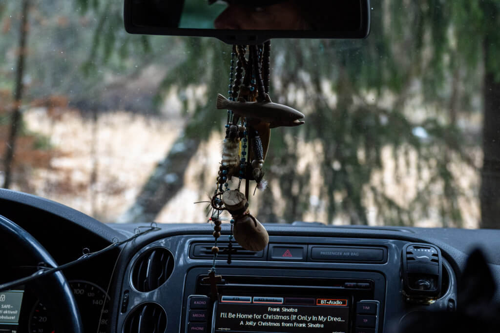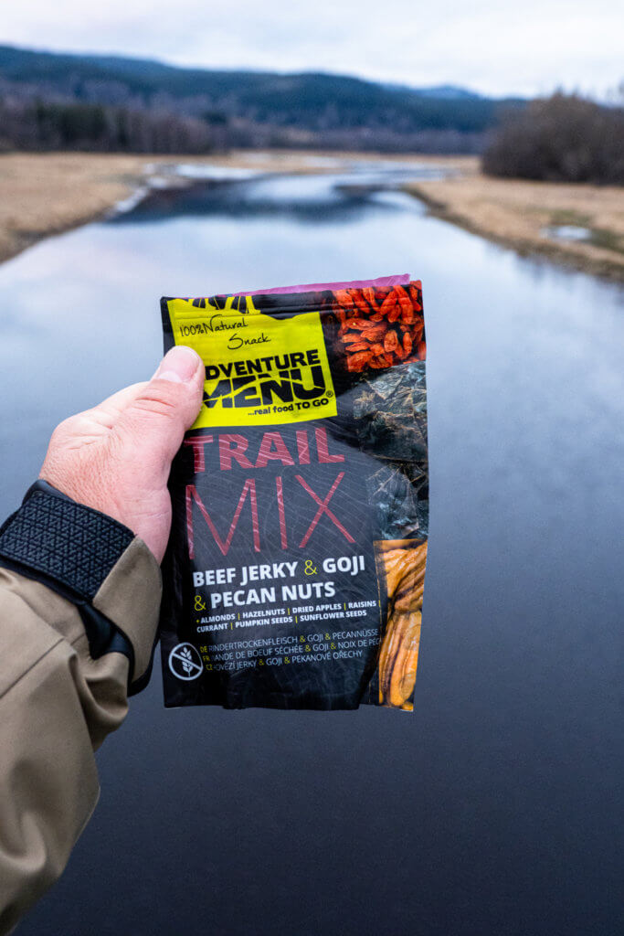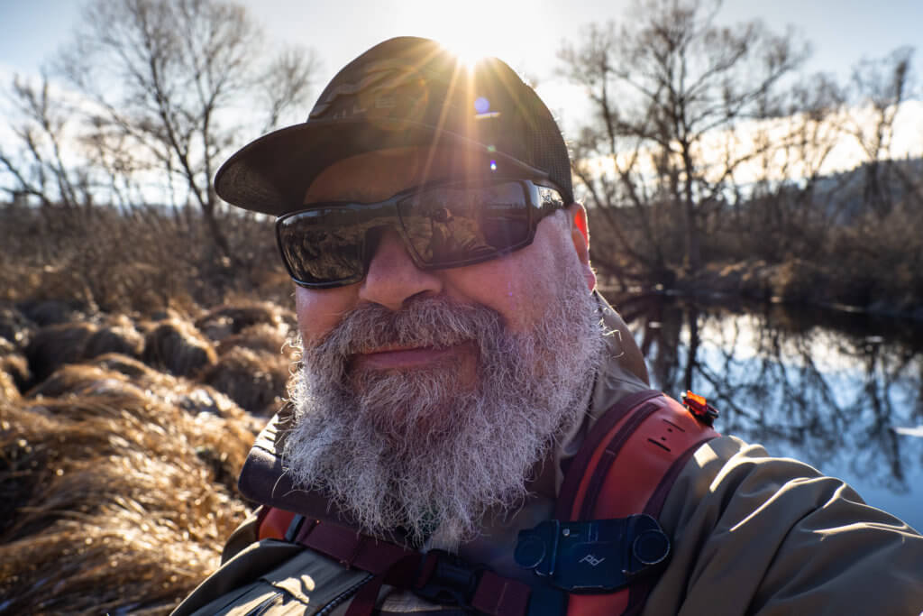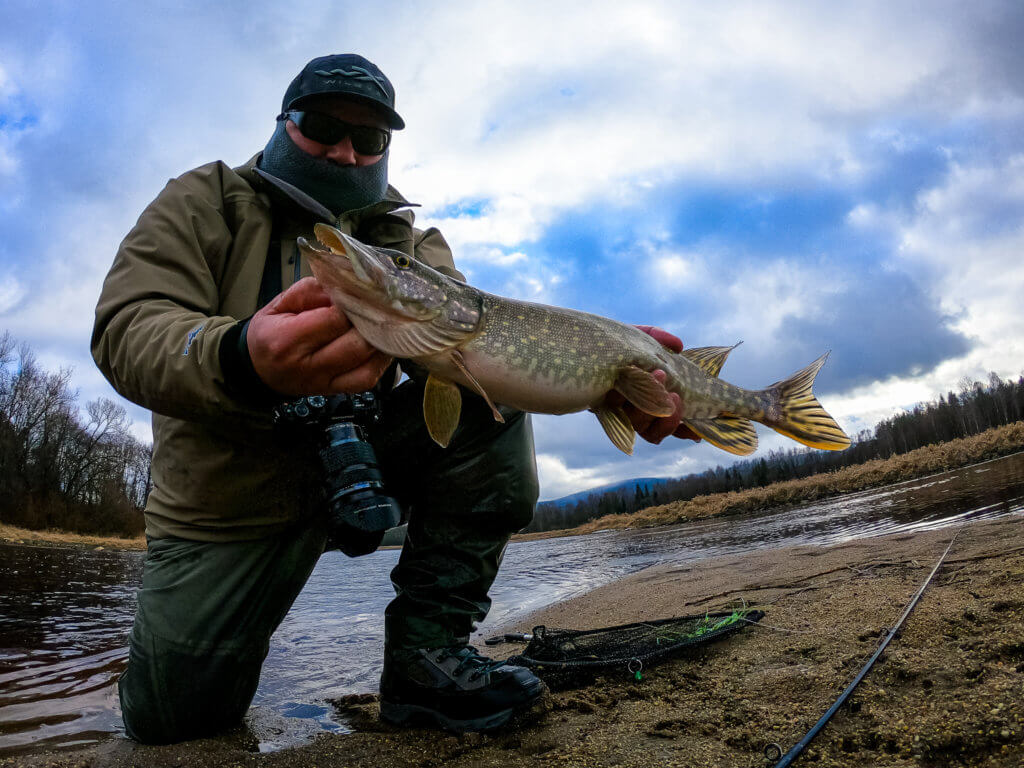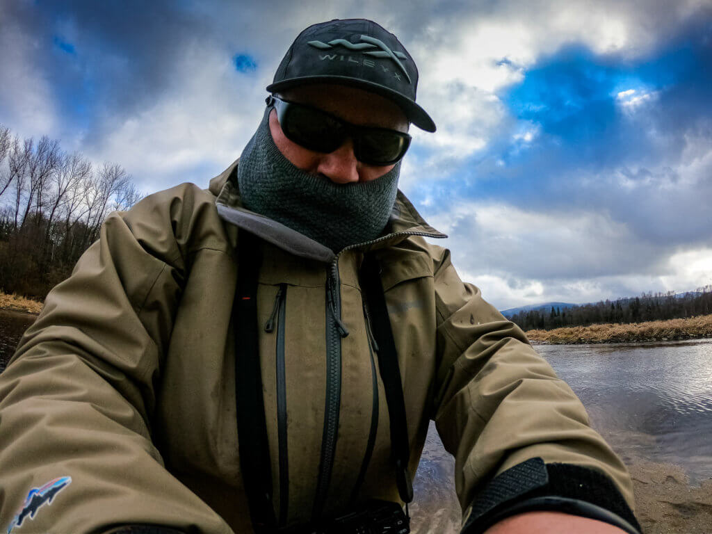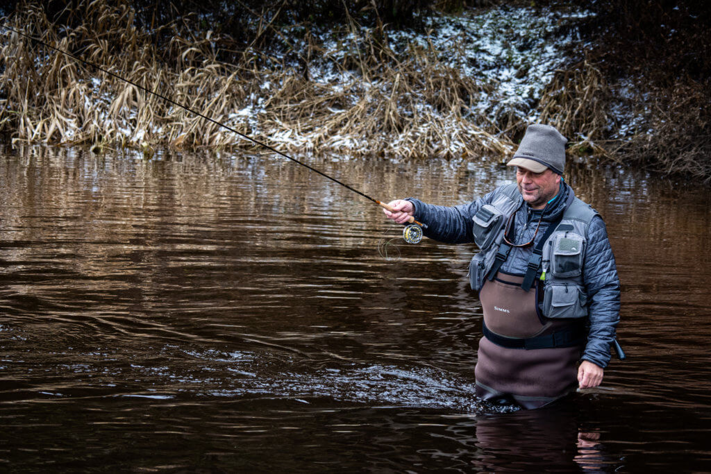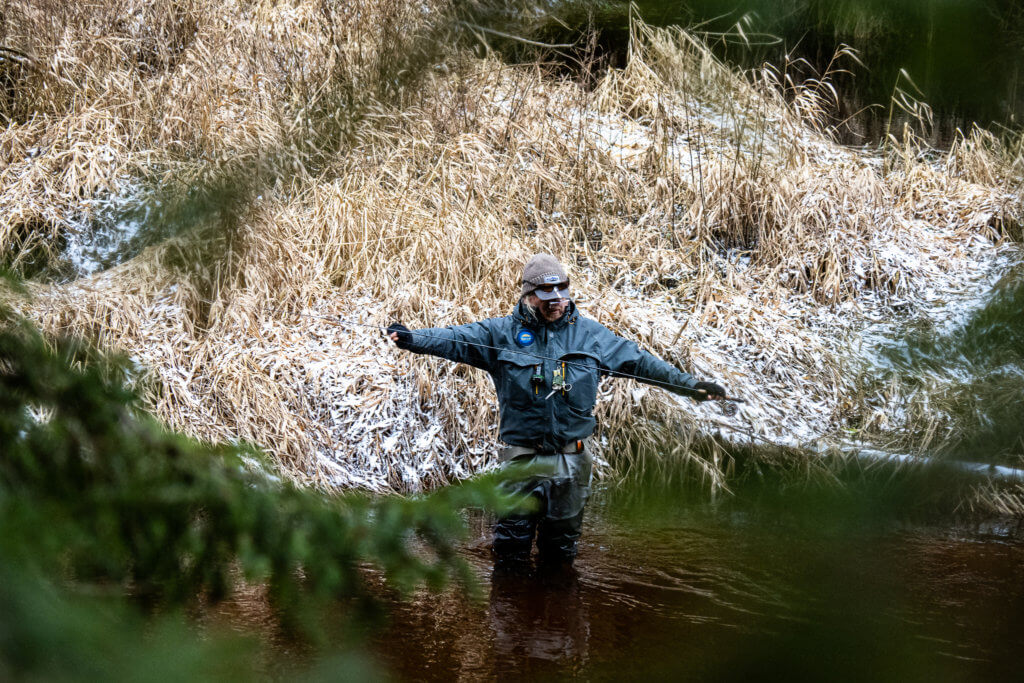 Pár slov ke stylu. Poslední dobou mě baví hlavně strímrovat. Takže tahám větší věci, opravdu nahazuju, jen tak nešmrdlám s nymfama. To mě taky baví, ale teď mám strímrovací období. Velká nástraha, jeden návazec, žádný převazování, protože na konci mám karabinku. Pokud měním mušku, tak možná jednou, dvakrát za den. Žádná vesta s tisíci muškami, žádný další serepetičky. Čistý minimalismus. Extremní je v tom Honza. Tomu stačí jen kapsy od bundy. Já mám aspoň ten báglík na zádech, i když v něm je hlavně fototechnika a svačina. 😉