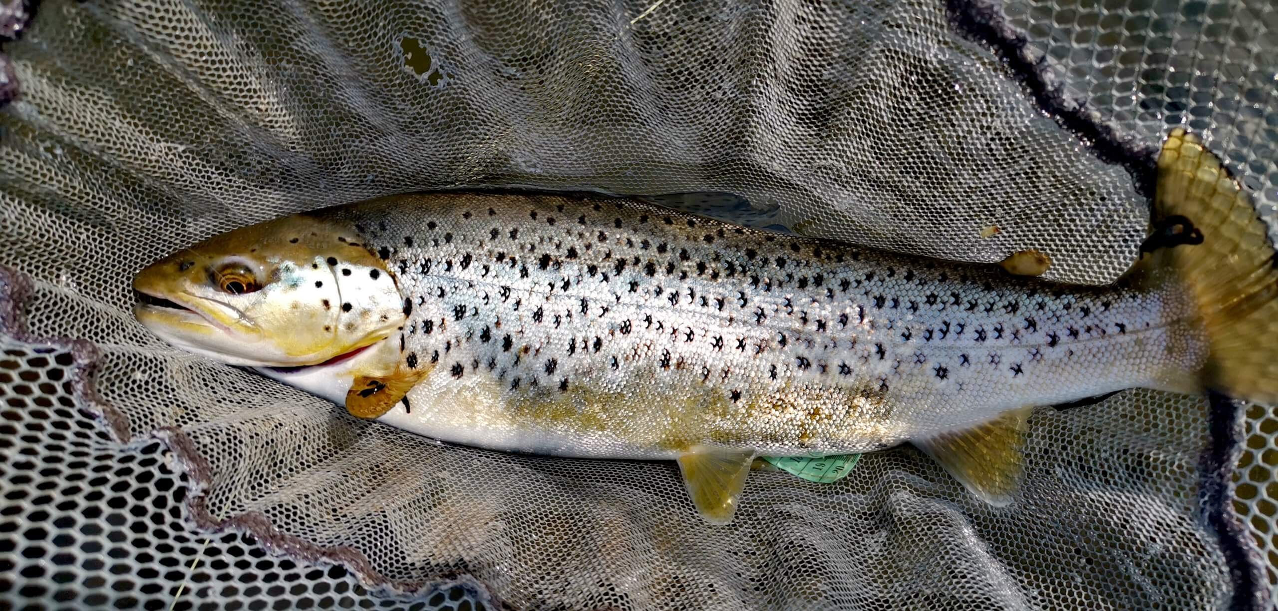 Vyrazil jsem proto ve 4 ráno, abych stihnul pracovní věci a v 8 jsem chtěl být u vody, což se tak i stalo. Na benzince klasická bageta a nějaké dobrůtky jako odměna za dobře odvedenou práci plus pivko. Ráno mě přivítalo takové to krásné šedé ostravské počasí, ale postupně bylo fakt hezky. Chtěl jsem začít nad mostem, kde byla vždycky slušná jamka, která tam teď už nebyla a tak jsem šel do prvního proudku směrem nahoru. Když nemusím, tak si nymfovací prut ani neberu. Tentokrát jsem si ale vzal jeden kousek, který jsem potřeboval dobře otestovat pro Hanák Competition. Proudek byl celkem plytký a tak se skoro nic nekonalo. Když jsem ale vbrodil a začal házet nymfy blíže břehu, najednou rána a první duhák přes 40cm už makal. Ale makal tak, že mi už mravenčila ruka. Taky jsem ho nešetřil.